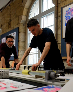 Lors de notre Journée Portes Ouvertes, nos anciens étudiant-es de Design Julien, Dorian, Audrey et Yann du collectif En Travaux, sont venus animer l’atelier de sérigraphie. Cette initiative offre une occasion de mettre en valeur leur travail et de présenter aux visiteurs les différentes perspectives de carrière après les études.
