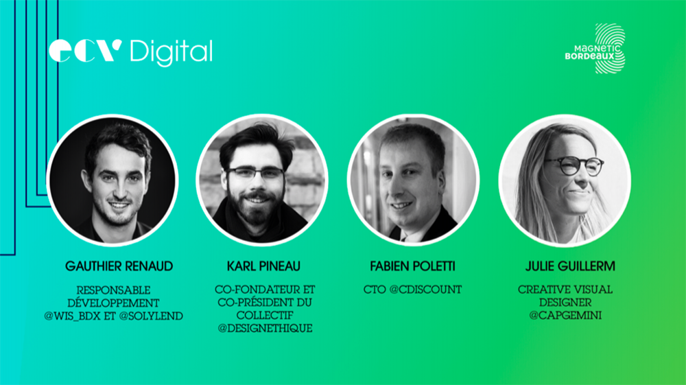 Cette table ronde d’exception accueillait Fabien Poletti, Chief Technical Officer à Cdiscount, Julie Guillerm, Creative Visual Designer à Capgemini, Karl Pineau, co-fondateur et co-président du collectif Design Ethique, ainsi que Nicolas Pereira, fondateur de Solylend et du WIS Bordeaux.